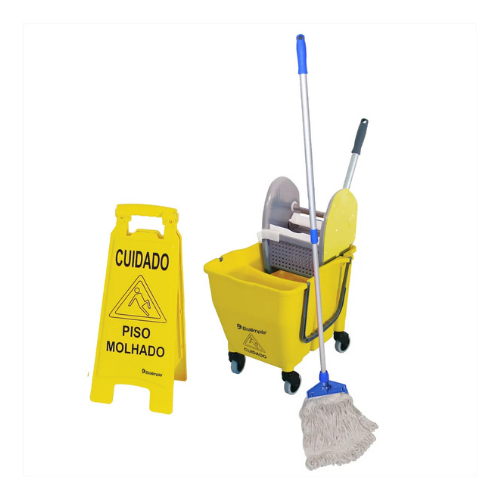 Itens que compõem o kit: 01 Conjunto Doblô 30 litros I 01 Cabo telescópio 1,40 metro I 01 Garra euro plástica I 01 Refil loop com cinta 320 G I 01 Placa sinalizadora piso Molhado